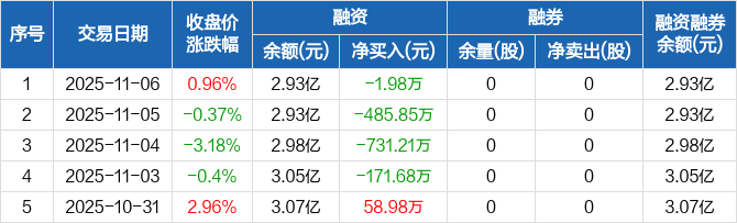 融资方面,当日融资买入2097.8万元,融资偿还2099.78万元,融资净偿还1.98万元,连续4日净偿还累计1390.73万元。融券方面,融券卖出0股,融券偿还0股,融券余量0股,融券余额0元。融资融券余额合计2.93亿元。