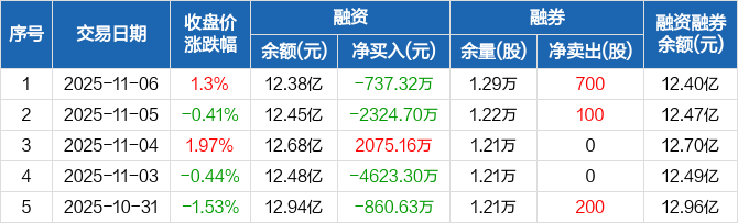 融资方面,当日融资买入4856万元,融资偿还5593.32万元,融资净偿还737.32万元。融券方面,融券卖出700股,融券偿还0股,融券余量1.29万股,融券余额203.82万元。融资融券余额合计12.4亿元。