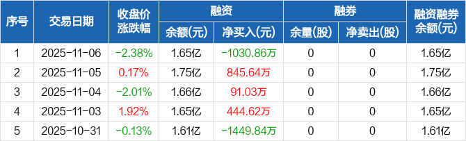融资方面,当日融资买入3047.35万元,融资偿还4078.21万元,融资净偿还1030.86万元。融券方面,融券卖出0股,融券偿还0股,融券余量0股,融券余额0元。融资融券余额合计1.65亿元。