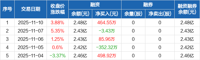 融资方面,当日融资买入1937.61万元,融资偿还1473.06万元,融资净买入464.55万元。融券方面,融券卖出0股,融券偿还0股,融券余量0股,融券余额0元。融资融券余额合计2.48亿元。