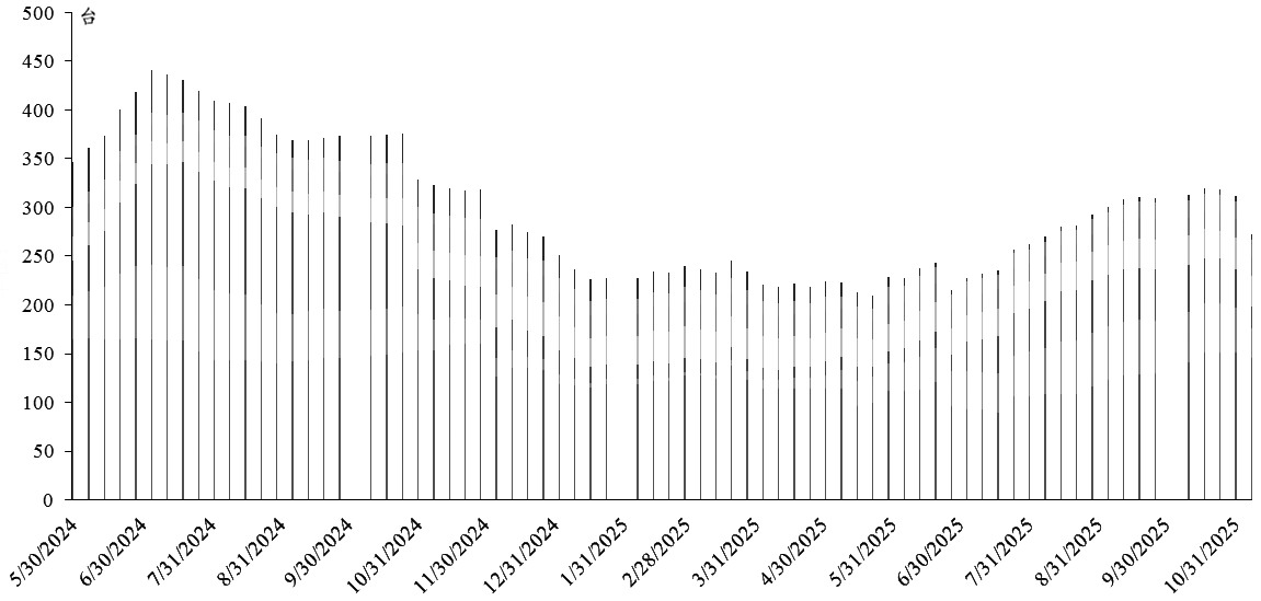 从需求端看,变动主要来自多晶硅板块。2024年下半年以来,在行业自律减产的推动下,多晶硅企业多处于减产状态,开工率持续维持低位。今年7月以来,多晶硅价格触底反弹,加之西南产区进入成本较低的丰水期,多晶硅企业利润得到极大修复,企业开工率有所回升,月产维持在13万吨左右。11月,预计多晶硅产量将降至12万吨左右,减量主要来自四川和云南地区,且内蒙古地区或有相应的复产增量。从光伏终端市场看,考虑上半年“抢装潮”带来的需求前置及光伏电价上网政策的调整,四季度难有明显增量,后续持续关注多晶硅产能整合的落地情况。从有机硅板块看,随着华南、西南地区检修逐步完成并恢复生产,企业开工率或将有所回升,对工业硅需求增加,但从企业备库看,采买心态不佳,以刚需补库为主,工业硅现货成交价涨跌并存。