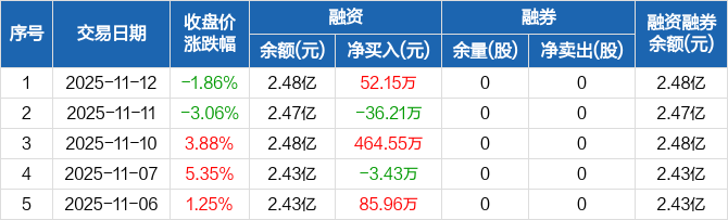 融资方面,当日融资买入688.77万元,融资偿还636.62万元,融资净买入52.15万元。融券方面,融券卖出0股,融券偿还0股,融券余量0股,融券余额0元。融资融券余额合计2.48亿元。