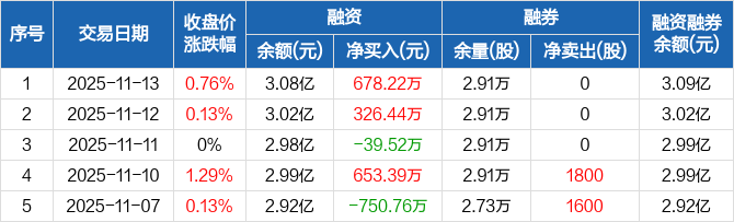 融资方面,当日融资买入1588.32万元,融资偿还910.1万元,融资净买入678.22万元。融券方面,融券卖出0股,融券偿还0股,融券余量2.91万股,融券余额23.11万元。融资融券余额合计3.09亿元。