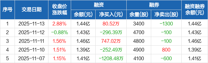 融资方面,当日融资买入1274.48万元,融资偿还1193.96万元,融资净买入80.52万元。融券方面,融券卖出200股,融券偿还1500股,融券余量3400股,融券余额4.74万元。融资融券余额合计1.44亿元。
