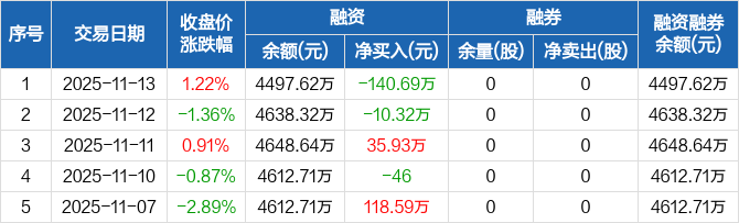 金钟股份融资融券信息显示,2025年11月13日融资净偿还140.69万元;融资余额4497.62万元,较前一日下降3.03%。