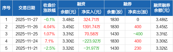 融资方面,当日融资买入1487.01万元,融资偿还1162.3万元,融资净买入324.71万元,连续3日净买入累计1787.03万元。融券方面,融券卖出0股,融券偿还0股,融券余量1830股,融券余额12.76万元。融资融券余额合计3.48亿元。
