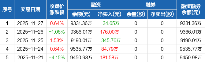 融资方面,当日融资买入304.57万元,融资偿还339.22万元,融资净偿还34.65万元。融券方面,融券卖出0股,融券偿还0股,融券余量0股,融券余额0元。融资融券余额合计9331.36万元。