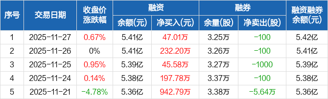 融资方面,当日融资买入947.12万元,融资偿还900.11万元,融资净买入47.01万元,连续5日净买入累计1465.35万元。融券方面,融券卖出0股,融券偿还100股,融券余量3.25万股,融券余额24.38万元。融资融券余额合计5.42亿元。