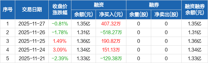 融资方面,当日融资买入904.2万元,融资偿还496.87万元,融资净买入407.32万元。融券方面,融券卖出0股,融券偿还0股,融券余量0股,融券余额0元。融资融券余额合计1.35亿元。
