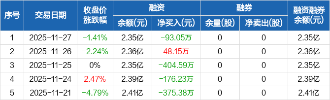 兆日科技融资融券信息显示,2025年11月27日融资净偿还93.05万元;融资余额2.35亿元,较前一日下降0.39%。