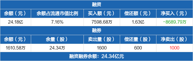 融资方面,当日融资买入7598.68万元,融资偿还1.63亿元,融资净偿还8689.79万元,净偿还额两市排名第17,连续3日净偿还累计1.03亿元。融券方面,融券卖出1600股,融券偿还600股,融券余量24.34万股,融券余额1610.58万元。融资融券余额合计24.34亿元。