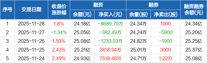 新泉股份融资融券信息显示,2025年11月28日融资净偿还8689.79万元;融资余额24.18亿元,较前一日下降3.47%。