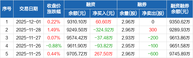 融资方面,当日融资买入415.57万元,融资偿还354.97万元,融资净买入60.6万元。融券方面,融券卖出400股,融券偿还400股,融券余量2.96万股,融券余额40.52万元。融资融券余额合计9350.62万元。