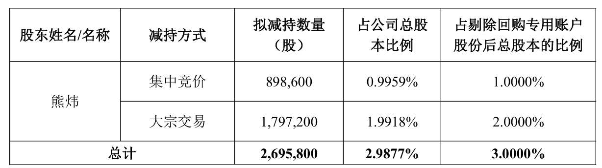 12月1日晚间,开勒股份(301070)发布公告称,公司大股东熊炜计划自本公告披露之日起15个交易日后的3个月内以集中竞价、大宗交易的方式合计减持本公司股份不超过269.58万股,占公司总股本比例不超过2.9877%。