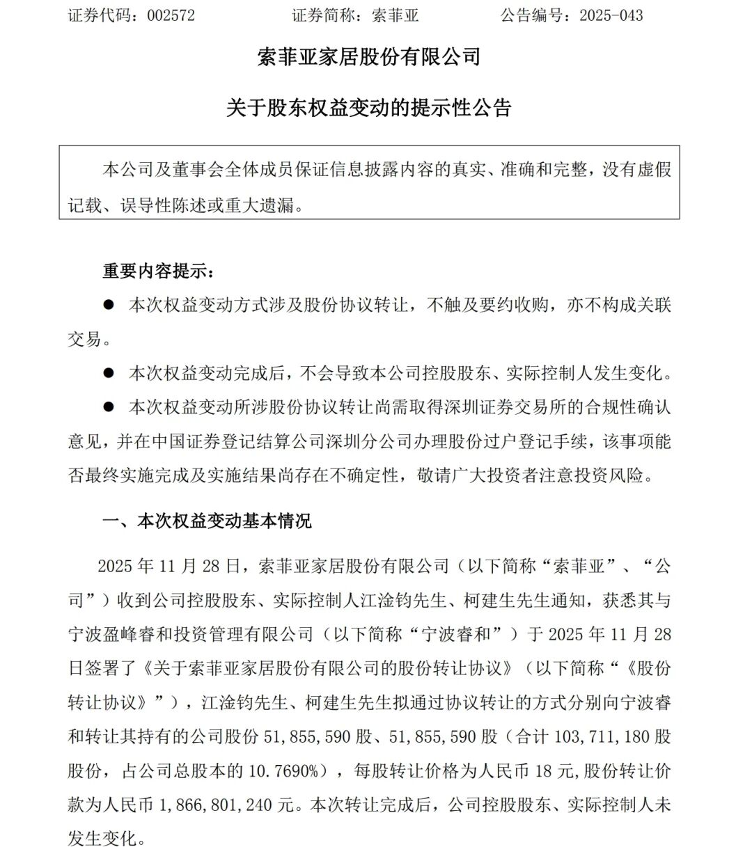 近日,索菲亚发布公告称,公司控股股东、实际控制人江淦钧、柯建生拟通过协议转让的方式向宁波盈峰睿和投资管理有限公司(下称“宁波睿和”)转让其所持公司股份合计1.04亿股,占公司总股本的10.77%,转让价格为18元/股,总价达18.67亿元。