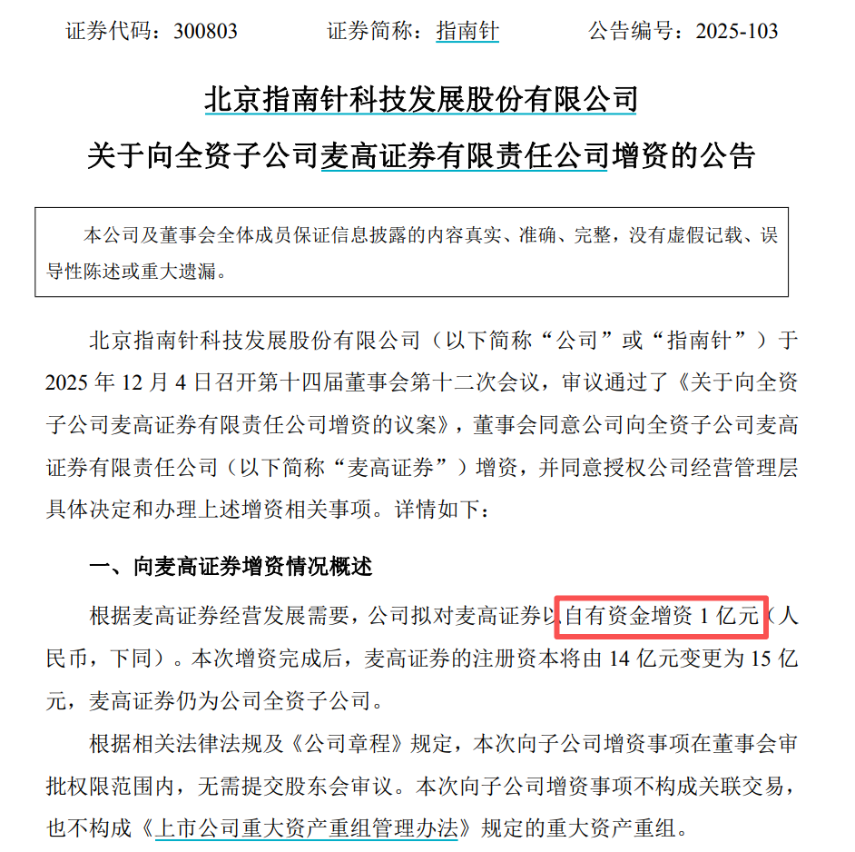12月4日晚间,指南针发布公告称,根据麦高证券经营发展需要,公司拟对麦高证券以自有资金增资1亿元。