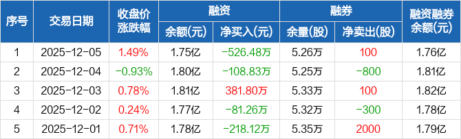 融资方面,当日融资买入614.86万元,融资偿还1141.34万元,融资净偿还526.48万元。融券方面,融券卖出100股,融券偿还0股,融券余量5.26万股,融券余额68.12万元。融资融券余额合计1.76亿元。