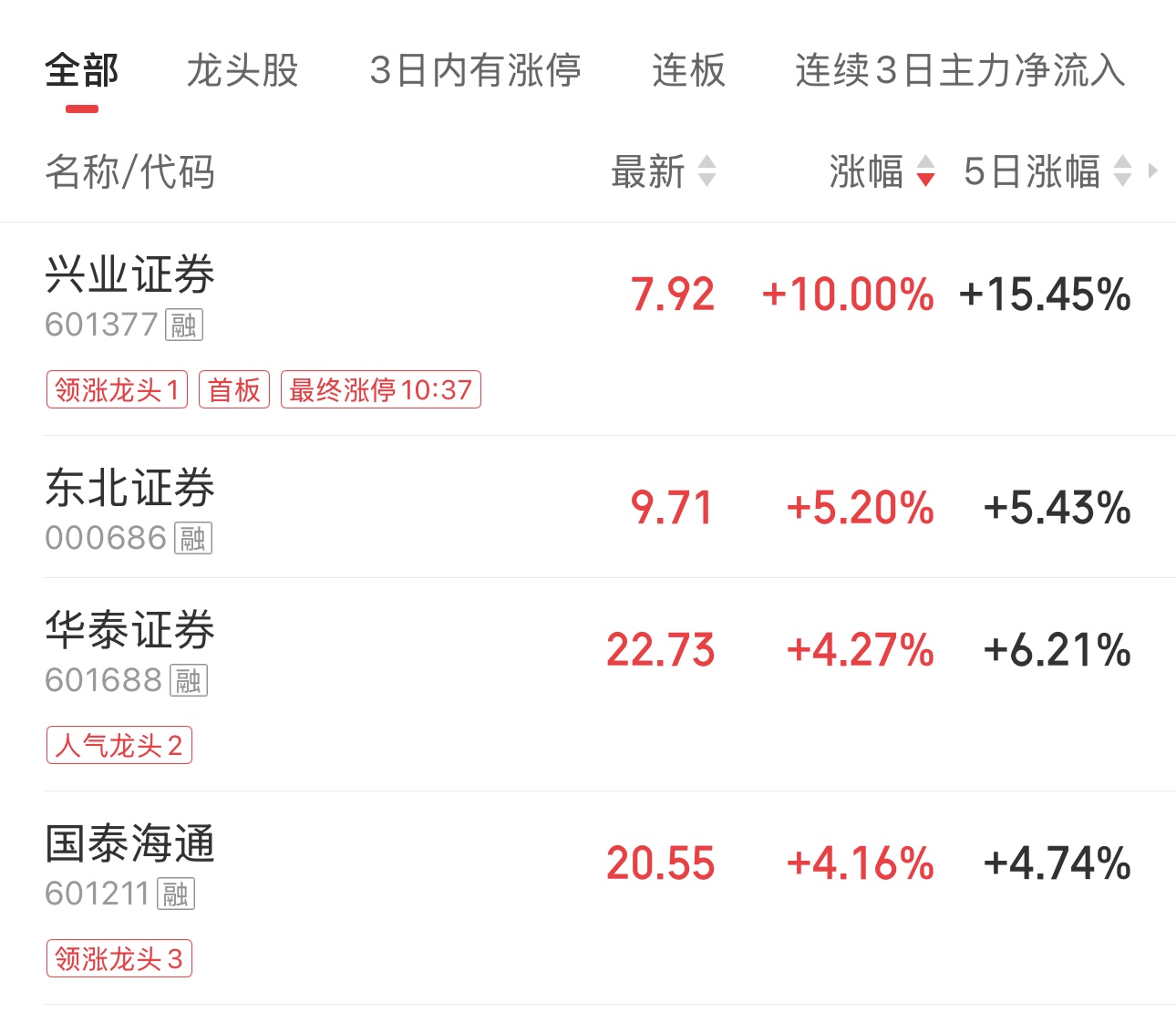 除因并购重组事项停牌的中金公司、信达证券、东兴证券外,板块内其余47只个股全线飘红,兴业证券涨停,半日成交额达47.62亿元;东北证券涨超5%,华泰证券、国泰海通均涨超4%;行业龙头中信证券半日成交额超65亿元。