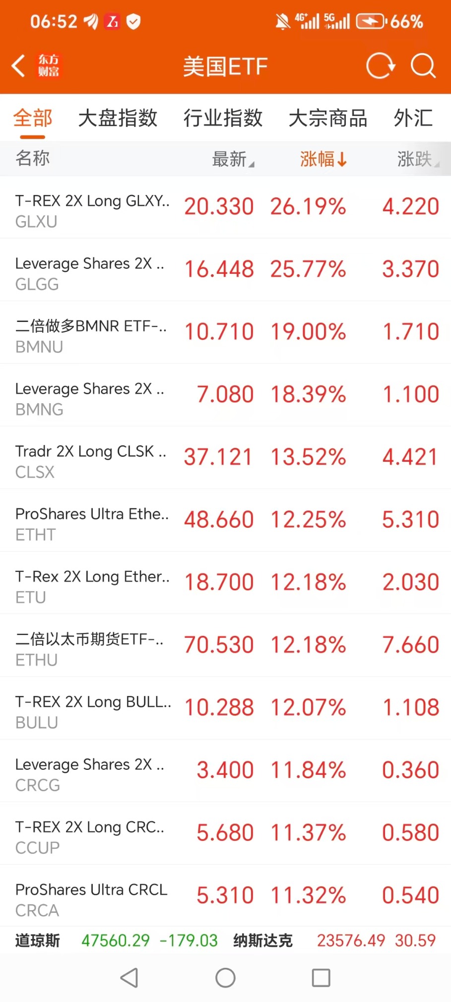 美股ETF升幅榜Top52倍做多GLXY ETF-Leverage Shares (GLGG.US) 升25.77%,成交额162.91万美元。