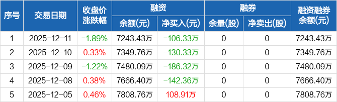 融资方面,当日融资买入119.81万元,融资偿还226.14万元,融资净偿还106.33万元,连续4日净偿还累计565.33万元。融券方面,融券卖出0股,融券偿还0股,融券余量0股,融券余额0元。融资融券余额合计7243.43万元。