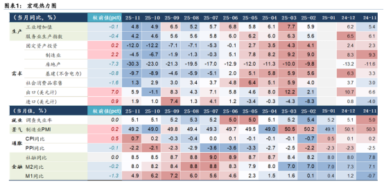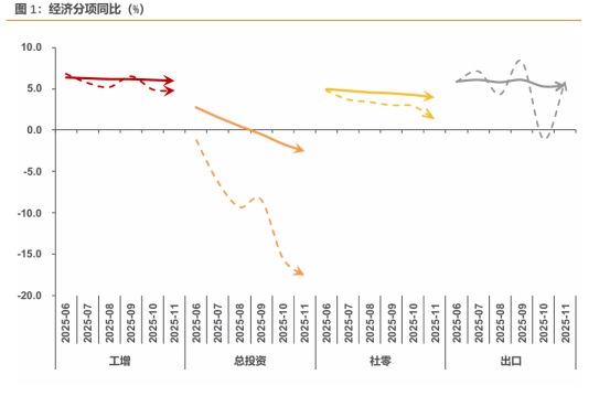 11月经济延续低温,除了出口反弹,大部分指标延续“低温”、且呈现加速下滑迹象,尤其是消费和投资。一方面,在基数回落、假期错位、中欧货运节奏等因素的影响下,11月出口同比转正并大幅回升,出口韧性持续偏强;另一方面,在地产景气回落、“反内卷”限产、政策性金融工具效果暂不明显等因素影响下,地产、基建和制造业投资增速普遍回落;而在补贴效力减退叠加高基数下,消费增速也继续回落,服务消费保持韧性则是一大亮点;再结合11月物价延续低位、PMI连续8个月处于线下、新增信贷规模低于季节性等数据,均指向当前经济内生动能仍偏弱,需求不足的问题仍然突出。