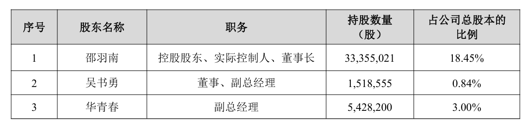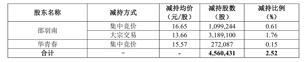 其中,邵羽南计划以集中竞价、大宗交易方式减持公司股份不超过480.1万股(含本数),即不超过公司总股本的2.66%;吴书勇计划以大宗交易方式减持公司股份不超过37.96万股(含本数),即不超过公司总股本的0.21%;华青春计划以集中竞价方式减持公司股份不超过24.35万股(含本数),即不超过公司总股本的0.13%。