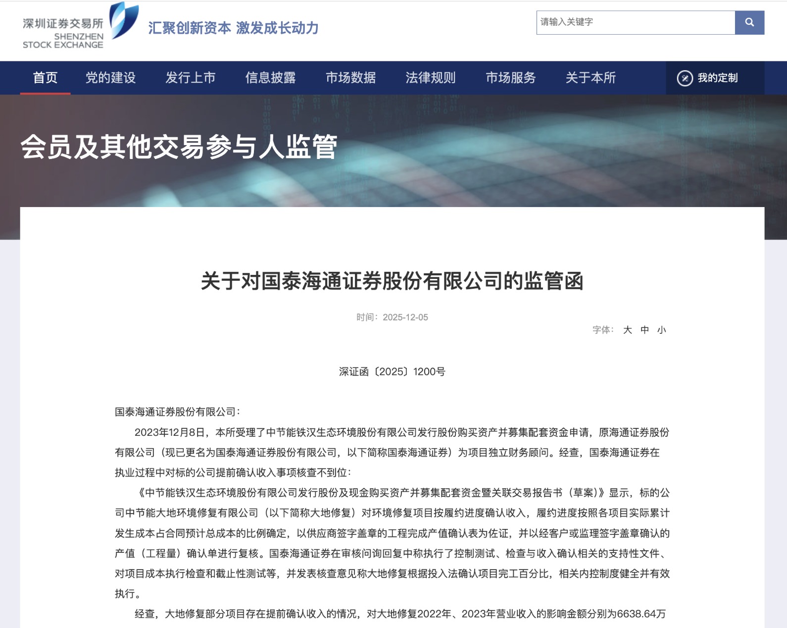央广网北京12月20日消息(记者樊瑞)日前,国泰海通收到一份来自深交所的监管函,因涉及项目独立财务顾问,深交所对国泰海通采取书面警示的自律监管措施,两名项目主办人朱凯凯、林子鹏也被通报批评。这已是国泰海通年内二度被罚。