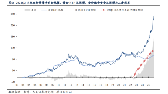 如何量化央行购金对黄金的影响?我们根据2003年至2022年11月间黄金ETF规模与金价的线性关系倒推出金价隐含的黄金ETF需求。截至2025Q3,黄金ETF规模为96.65百万oz,金价隐含黄金ETF规模为235.91百万oz,二者残差139.27百万oz,接近于2022Q3至2025Q3期间全球央行净购金规模116.15百万oz。将2022Q3至2025Q3期间黄金ETF残差与全球央行累计净购金规模进行回归分析可发现,央行购金对黄金ETF残差有92.78%的解释力。