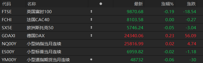 周三盘前,美股三大股指期货震荡盘整,欧洲主要指数多数下跌。截至发稿,纳斯达克100指数期货涨0.02%,标普500指数期货跌0.02%,道指期货跌0.06%。