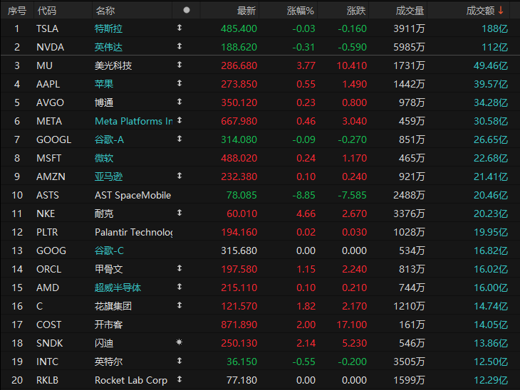 第3名美光收高3.77%,成交49.46亿美元。券商Argus Research周三将美光科技的目标价从210美元上调至320美元。Argus指出,人工智能解决方案推动整体业绩增长,美光多个终端市场的需求正在复苏。
