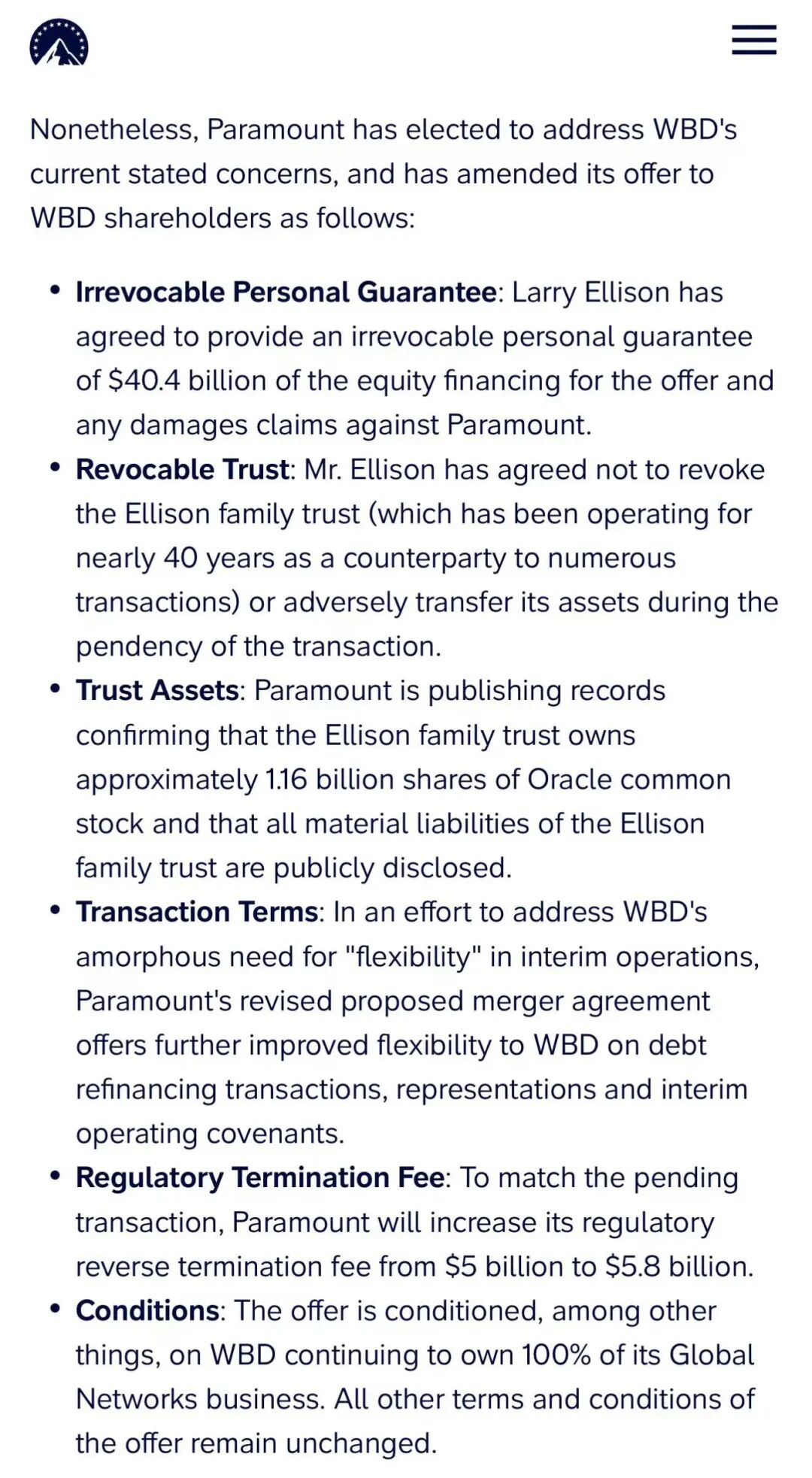 具体来看,WBD在公开信中反复强调派拉蒙方案的风险:其资金安排高度依赖埃里森家族设立的一项可撤销信托,但相关法律文件被指“存在多处空白、条款漏洞与实质性限制”,且该信托的责任上限被设定为承诺总额的仅7%(约合28亿美元)。一旦该信托或派拉蒙方面最终未能履行交割义务,给华纳及其股东造成的实际损失将是这一有限责任的数倍。