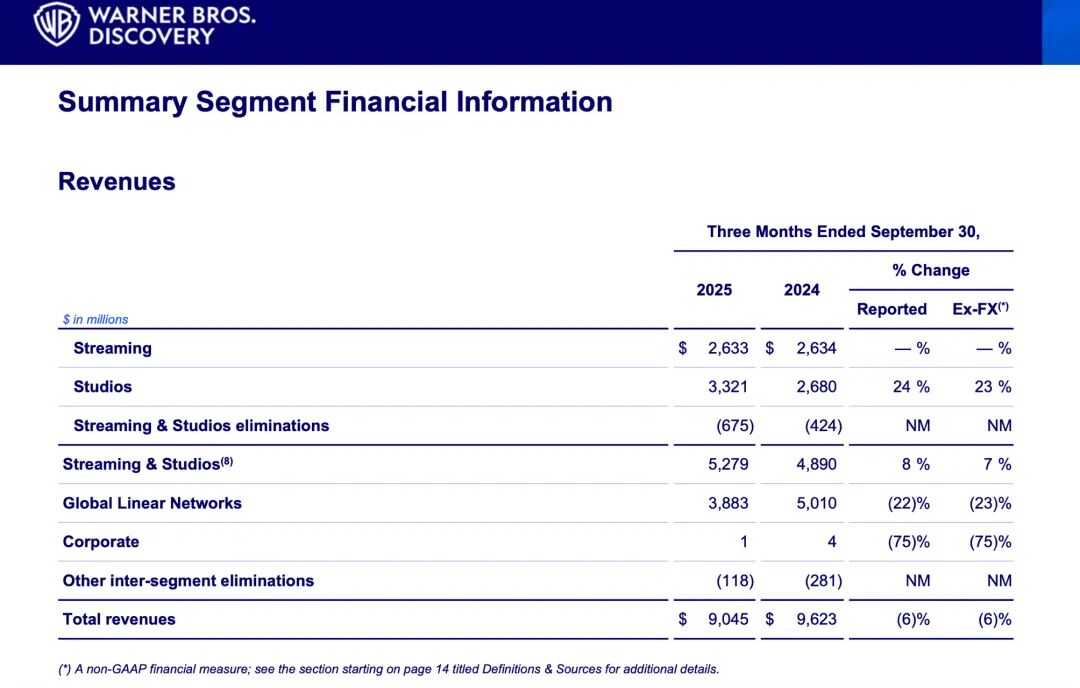 财报显示,今年第三季度,WBD总收入同比下滑6%至90.45亿美元,并录得1.48亿美元亏损。从收入构成来看,其全球线性电视网络收入(Global Linear Networks )同比大跌23%至38.83亿元;而流媒体与工作室(Streaming & Studios)收入同比增长7%至52.79亿美元,占比总收入的58.4%。