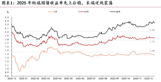 2025年债市呈“快牛慢熊、震荡为主”特征,10年期国债收益率在1.6%–1.9%区间反复波动,收益率曲线由牛陡转熊平、再转熊陡。年初宽松预期抢跑下长端快速下行、资金偏紧推升短端,曲线转熊平;二季度外部冲击与政策落地交织,利率触底后横盘、曲线趋平;三季度起风险偏好回升叠加供给与制度扰动,长端上行、短端相对稳定,曲线转熊陡;四季度流动性偏宽松但机构行为压制超长端,熊陡进一步加深。总体看,曲线演化体现风险偏好修复与资管格局调整推动期限利差中枢上移。