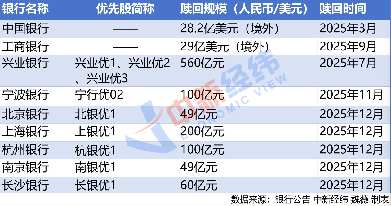 中新经纬12月26日电 (魏薇)2025年12月24日,南京银行发布公告,宣布其2015年发行的0.49亿股优先股“南银优1”已全部赎回并完成摘牌。此前长沙银行公告称,拟于2025年12月25日全额赎回该行于2019年12月20日非公开发行的6000万股优先股。