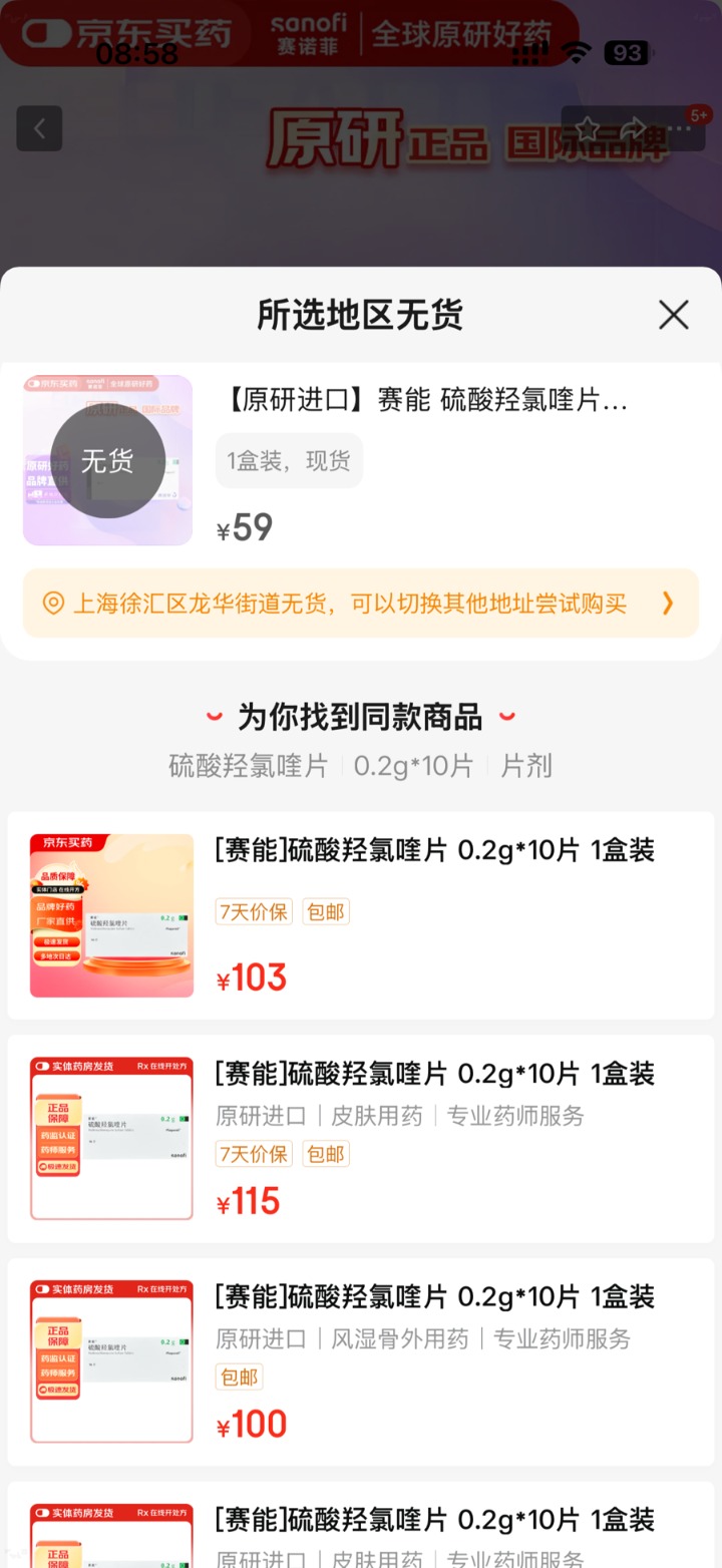 “赛能”成分为“硫酸羟氯喹片”,由法国药企“赛诺菲”生产。12月24日,记者在“京东”平台上看到,京东自营的售价最低,为59元一盒,但显示为“无货”,其余商家售价均为110元上下一盒,最贵的已涨至120元一盒。记者从社交媒体上了解到,京东自营偶尔会补货,需要蹲守和秒杀,且限制一个账号每个月只能购买两盒。也就是说,眼下在医院以外的渠道,购买“赛能”只能接受百元一盒的售价。