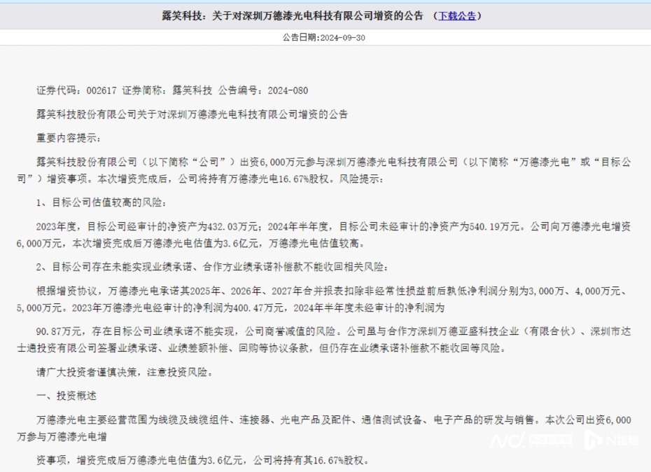 然而,据露笑科技公告披露,万德溙2023年全年净利润为400.47万元。露笑科技2024年报显示,万德溙2024年营业收入为4680万,净利润677万,该企业负债合计2035万。目前,尚未有万德溙光电2025年度的最新财务数据披露。市场对其经营状况的判断主要依据其2023年及2024年业绩,与承诺的2025年3000万元净利润目标存在不小差距,成为评估此次收购风险的核心焦点之一。