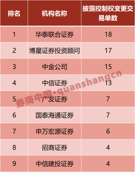 控制权变更交易首次披露口径,9家券商市占率50%,华泰联合证券排名第一