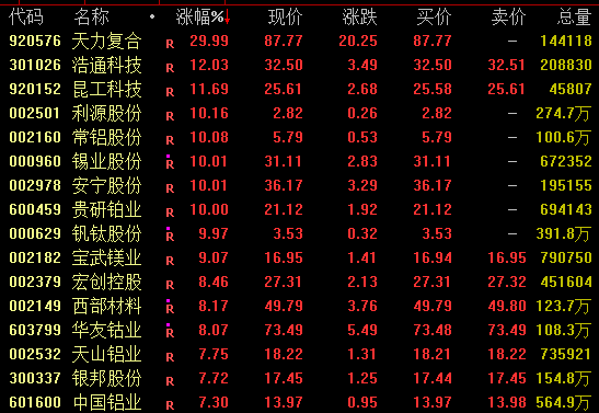 有色板块盘中集体飙升,钴、镍概念股表现尤为亮眼。截至收盘,常铝股份、锡业股份、贵研铂业等涨停,华友钴业涨逾8%;紫金矿业涨超6%创历史新高,全日成交131.9亿元。