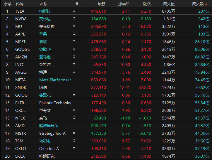第8名英特尔收高10.80%,成交82.74亿美元。该股本周累计上涨15.67%。周四,美国总统特朗普在白宫会见了英特尔CEO陈立武。此前美国政府已购买了这家芯片制造商的股份,两人在会面中讨论了该公司新系列处理器的进展情况。特朗普在网络平台上发帖,赞扬了英特尔所取得的进展。自去年计划由联邦政府购买该公司高达10%的股份以来,英特尔的股价已上涨约75%。到目前为止,美国政府已累计持有约5.5%的股份,并准备进一步收购。
