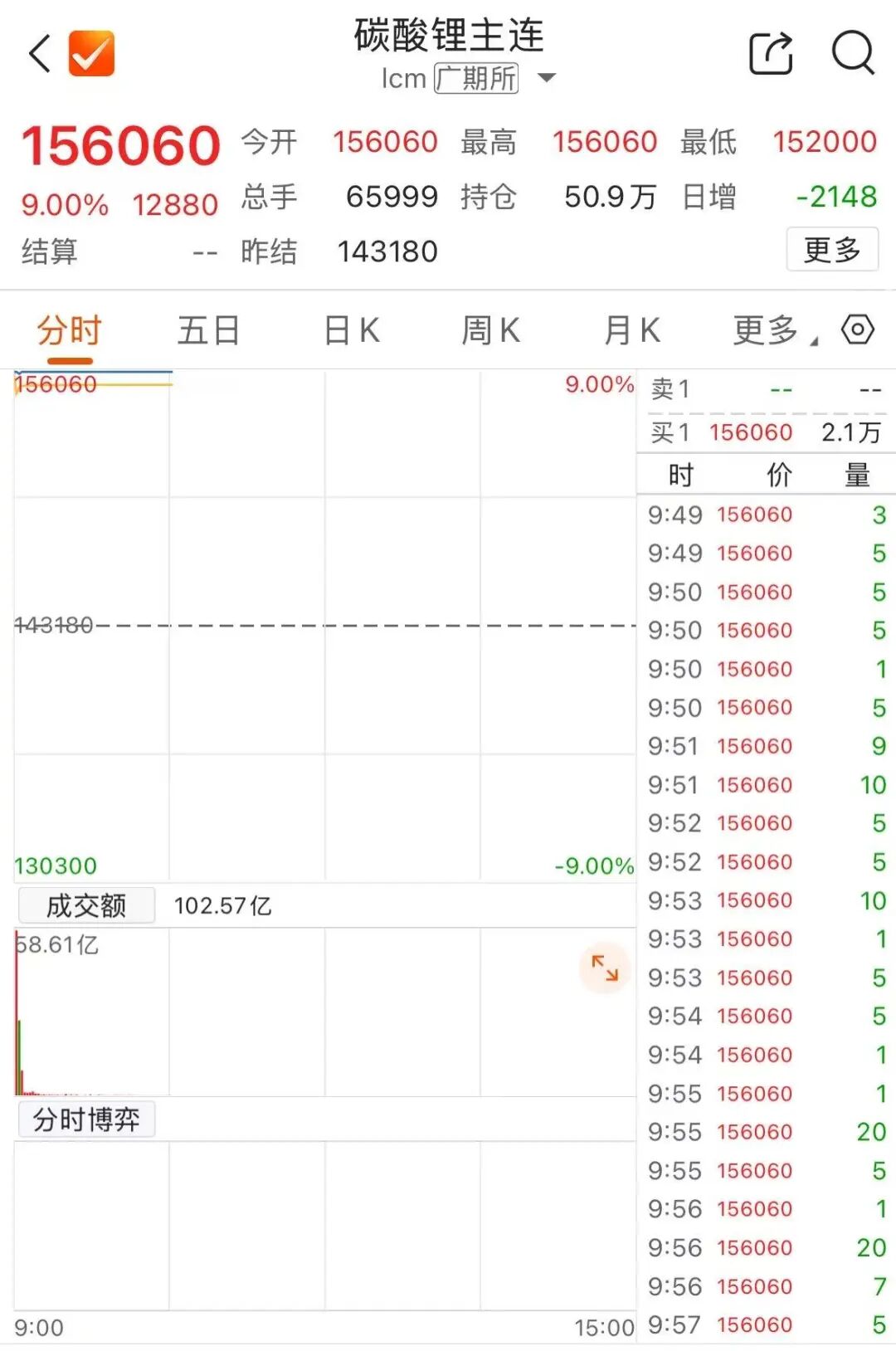 碳酸锂主力合约早盘涨停,触及15.61万元/吨高点,创下2023年9月以来新高。A股锂矿概念股大涨,大中矿业涨超6%,金圆股份、西藏珠峰、盛新锂能涨超5%。