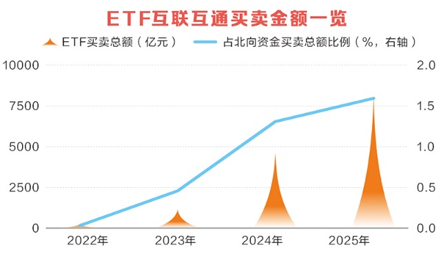 随着标的范围的持续扩容,ETF通的交易活跃度逐年攀升,北向资金借道ETF入场意愿显著提升。数据显示,2025年北向资金ETF买卖总额超过8100亿元,相比2024年的4600多亿元,大幅提升76%,买卖金额占北向资金买卖总额的比例达到1.62%,买卖金额及占比均创出历史新高。