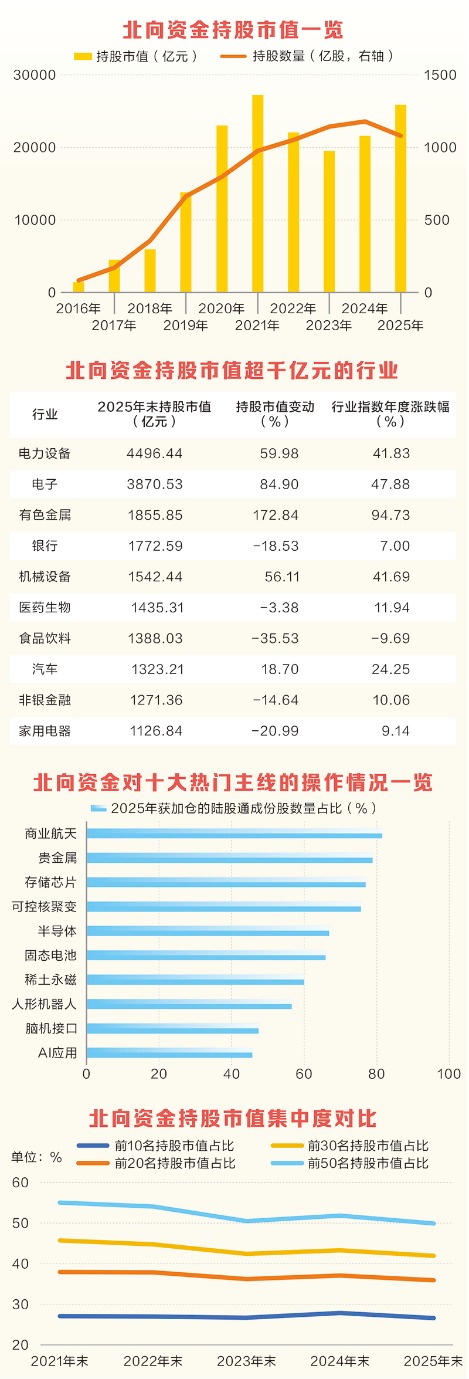 从行业来看,截至2025年12月31日,相较于过往偏好大金融及大消费,2025年以来,硬科技及有色金属行业成为北向资金的“新宠”。