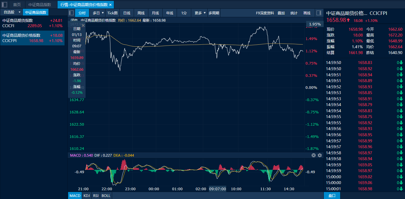 截至13日下午收盘,中证商品期货价格指数收报1658.98点,较前一交易日上涨18.08点,涨幅1.10%;中证商品期货指数收报2289.05点,较前一交易日上涨24.81点,涨幅1.10%。