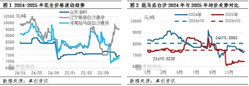 卓创资讯统计截至12月31日,2025年驻马店地区白沙花生通货米均价8238元/吨,同比下滑7.04%;阜新地区白沙花生通货米均价8525元/吨,同比下滑6.96%;山东油料均价7627元/吨,同比下滑7.02%。