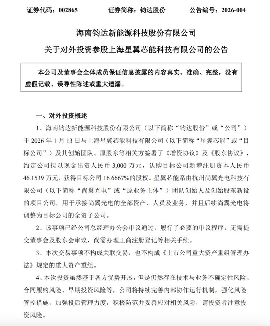 1月14日晚间,钧达股份发布《关于对外投资参股上海星翼芯能科技有限公司的公告》。钧达股份拟以现金出资3000万元,参股上海星翼芯能科技有限公司,认购星翼芯能46.1539万元新增注册资本并获其16.6667%股权,启动从地面光伏向太空光伏的战略延伸。
