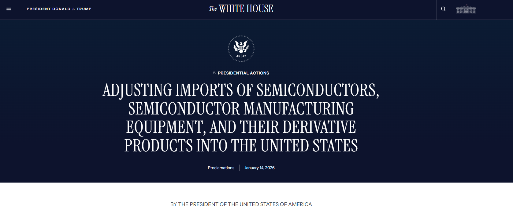 白宫公告还指出,特朗普在不久的将来也可能对半导体及其衍生产品的进口征收更广泛的关税,以激励国内制造业的发展。