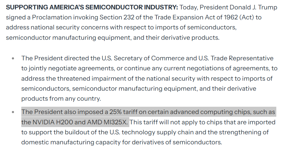 根据上述公告,25%的关税适用于“一类非常狭窄的半导体产品”,这些产品是政府人工智能和技术政策的重要组成部分。公告还提到,此次征税范围将包括英伟达H200和AMD MI325X。