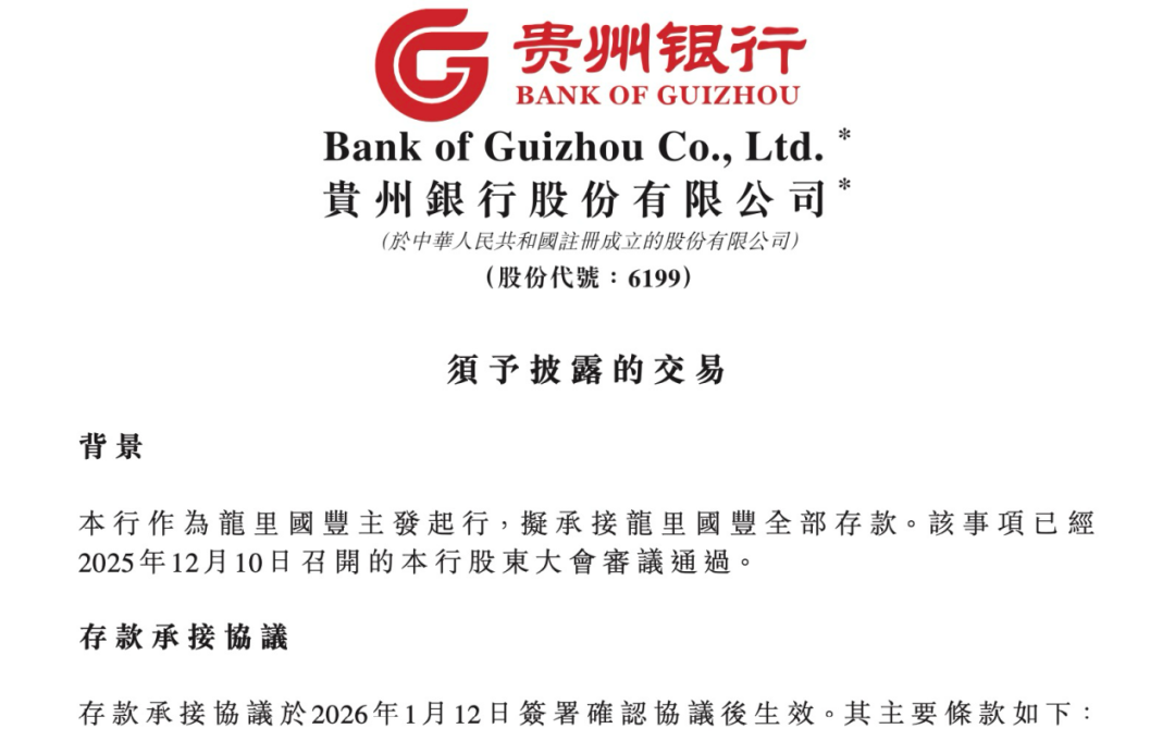 日前,港股上市银行贵州银行公告,贵州银行作为龙里国丰村镇银行的主发起行,拟承接龙里国丰村镇银行的全部存款。公告显示,双方的存款承接协议于2026年1月12日签署确认协议后生效。