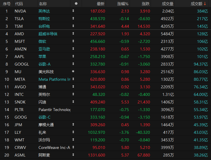 周四美股成交额第1名英伟达收高2.13%,成交384亿美元。受台积电财报带动,周四美股芯片板块普涨。