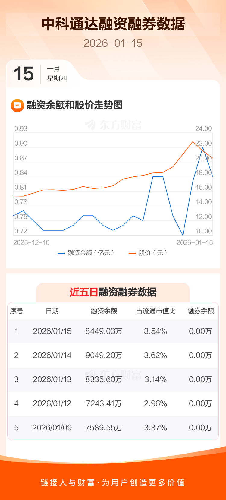 交易所最新数据显示,中科通达于2026年1月15日获融资买入896.62万元,融资偿还1496.79万元,当日融资净偿还600.17万元。目前,该股融资余额8449.03万,占流通市值比例为3.54%。